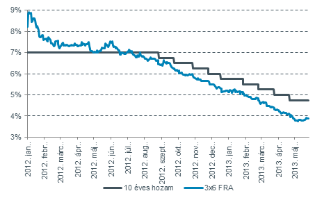 Érdemes egy pillantást vetni a határidős kamatlábak alakulására, mely azt testesíti meg, hogy a piac mekkora lazítást árazott be. A határidős kamatlábak alapján (3x6 FRA) jelenleg 3,87%-ra várja a piac a kamatszintet három hónap múlva. Érdekes fordulat azonban, hogy a lazítási ciklus augusztusi kezdete óta ez az első alkalom, hogy tartósan emelkedett a ráta (május elején még 3,77% volt. Jóllehet, hogy a 10 bázispontos eltérés nem jelentős, de mutatja, hogy a piaci szereplők óvatosabbak lett a radikálisabb lazítás kapcsán. Ez is arra utal, hogy a 4%-os szintet elérve már nem lesz egyértelmű, hogy tovább folytatódik-e a ciklus.