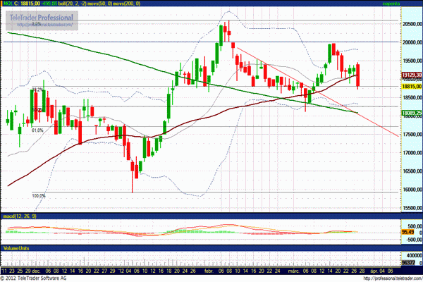Eddig tartott az 50 napos mozgóátlag, a tegnapi emelkedő forgalmú esés alapján az emelkedésre vonatkozó esélyek teljesen elhalványultak. Utolsó kapaszkodási pont a 18.800 forintos szint, törésével 18.250 forintig, illetve a 200 napos mozgóátlagig folytatódhat a csökkenés. Emelkedés során ellenállás 19.000 forintnál.
