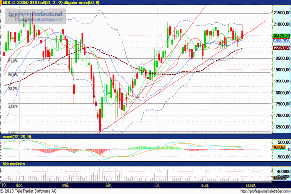 Az amerikai gazdasággal kapcsolatos aggodalmak nehezednek a világ részvénypiacaira. Félő, hogy ismét az USA döntheti be a világgazdaságot. A globális helyreállási folyamat úgy tűnik megtorpant, erre utalnak a Kínából, Japánból, illetve az USA-ból érkező makroadatok. Gyengélkednek az amerikai piacok is, ugyan tegnap a Dow indexet visszahúzták 10.000 pont fölé, azonban nagy az esély, hogy elesik a lélektani támasz, a pénteki napon. A Mol ára nem változott tegnap, 20.350 forintot ért záráskor, forgalma 2,6 milliárd forint volt. Nézzük a várható folytatásról mit mond a technikai elemző.