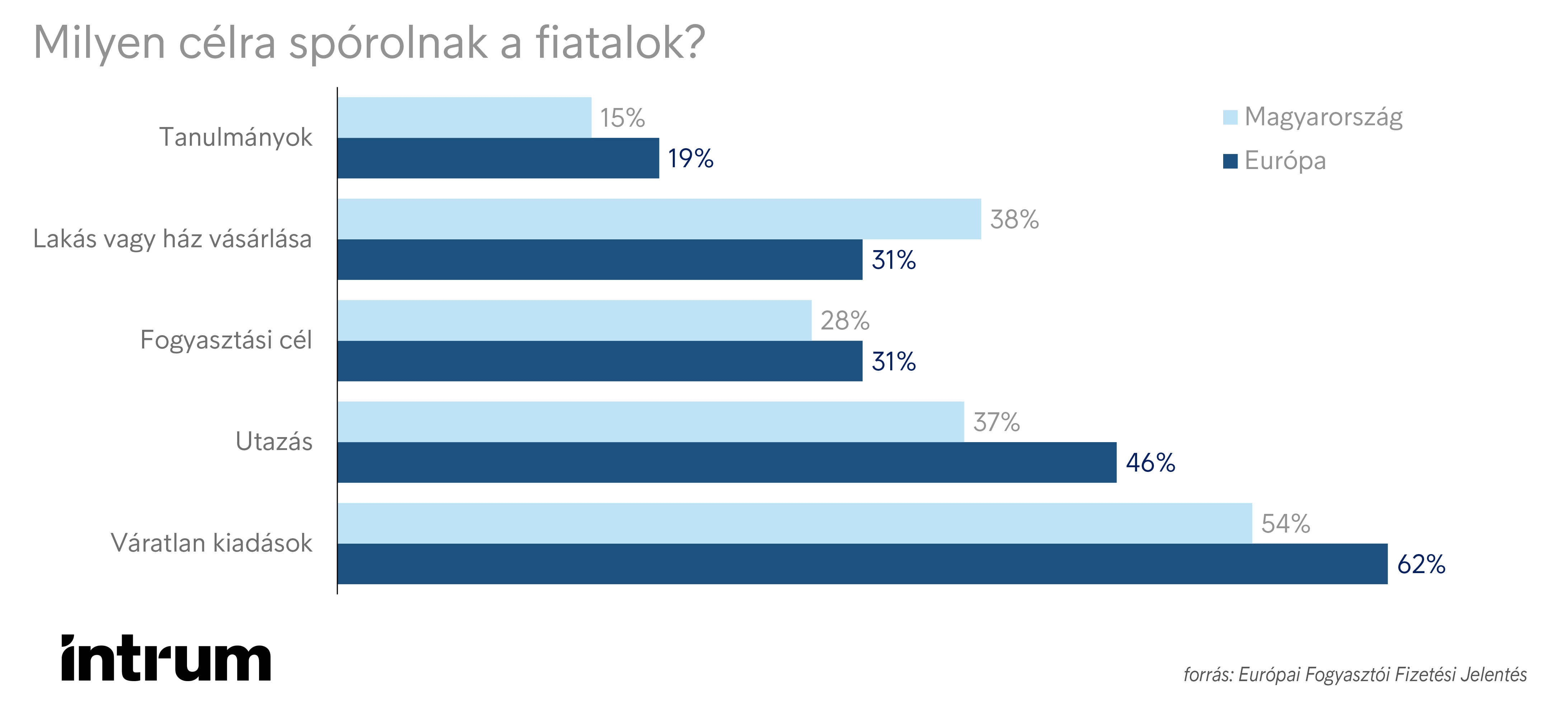 A 18-24 év közötti magyar fiatalok több mint fele számára fontos, hogy minden hónapban legyen megtakarításuk. Mind európai mind magyar viszonylatban a legfontosabb megtakarítási cél a váratlan kiadásokra való felkészülés. Míg az átlagos európai elsősorban utazásra, fogyasztási jellegű kiadásokra gyűjt, a magyar fiatalok számára kiemelten fontos spórolási cél a saját ingatlan megvásárlása, a megkérdezettek közel 40 százaléka kifejezetten erre a célra tesz félre. A megtakarítási célok sorában a harmadik helyen az utazás áll.