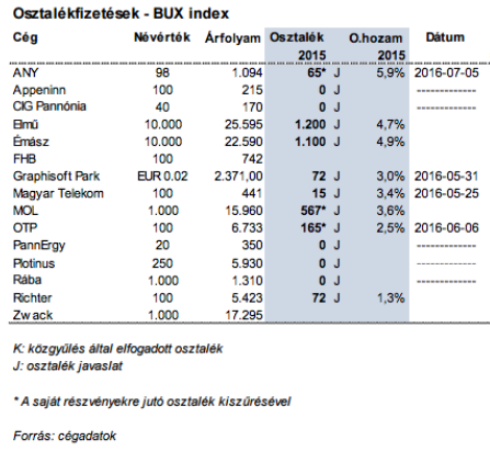 A legnagyobb cégek közül a Mol igazgatósága 55 milliárd forint osztalék kifizetésére tett javaslatot a 2015. év után, míg tavaly 50 milliárd forintot osztott szét. A teljes részvényszám alapján az idén 526 forint jut egy részvényre, azonban ennél többre, 567 forint körüli összegre számíthatnak a tulajdonosok, mivel a társaság a saját részvényekre eső részt is felosztja a többi részvényes között.