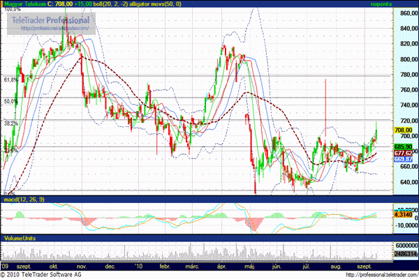 A múlt hét végén, illetve a hétfői napon még csak támadta, de a tegnapi napon határozottan, nagy forgalom mellett át is törte a 700 forintnál lévő ellenállási szintet az árfolyam, sőt egészen 720 forint közeléig nyújtózkodott. mindez pedig igen erős megerősítése az elmúlt hetekben tapasztalt folyamatnak, további emelkedés során ellenállás 720, illetve 750 forintnál. Csökkenés során a 700 forintnak már tartania kellene.