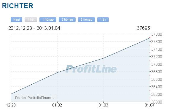 A Richter árfolyama egy hét alatt 4,10 százalékkal, 1 485 forinttal 37 695 forintra emelkedett. A másik gyógyszeripari részvény, az Egis 0,06 százalékos, 10 forintos emelkedéssel 17 595 forinton fejezte be a hetet.