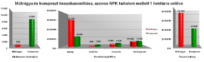 A mai szántóföldi termelés során egy hektár területre mintegy 180-220 kg vegyes NPK hatóanyag tartalmú műtrágya-készítménnyel kalkulálunk, ennek összköltsége - kijuttatással és bemunkálással együtt - akár meg is haladja a 80 ezer forintot. Amennyiben egy jól kezelt és forgalomba-hozatali engedéllyel rendelkező komposzt hektáronkénti 5 – 8 tonnájával végezzük a tápanyag-visszapótlást, úgy - azonos hatóanyagtartalmat kijuttatva - 40 – 45 ezer forint összköltséggel kell csak számolnunk – és a mikroelemeket „ajándékként” kapjuk.