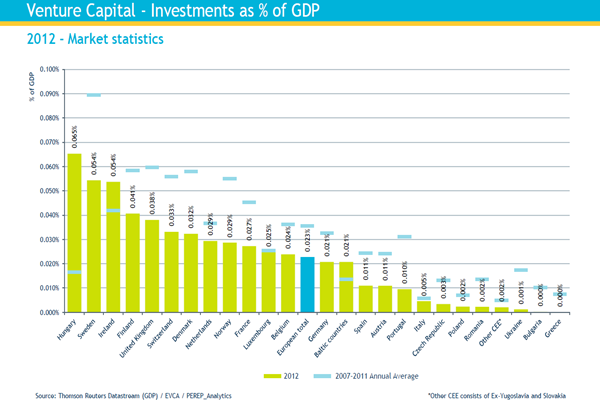 Ha a kockázatitőke-befektetések értékét az ország GDP-jéhez viszonyítjuk, Magyarország az iparági statisztikák alapján – Luxemburg és Dánia mögött – Európában a harmadik, piaci adatok alapján pedig az első helyen áll. Míg a hazai GDP-arányos kockázatitőke-befektetések értéke 2007 és 2011 között az európai átlagnak körülbelül a felét érte el, 2012-ben majdnem háromszorosan meg is haladta azt (Magyarország: 0,065%, Európa: 0,023%).