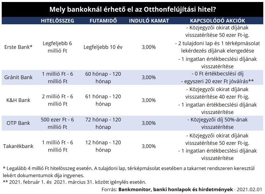 Az egyes bankok honlapjának és hitelhirdetményeinek áttanulmányozása alapján jelenleg 5 banknál érhető el a támogatott felújítási hitel.