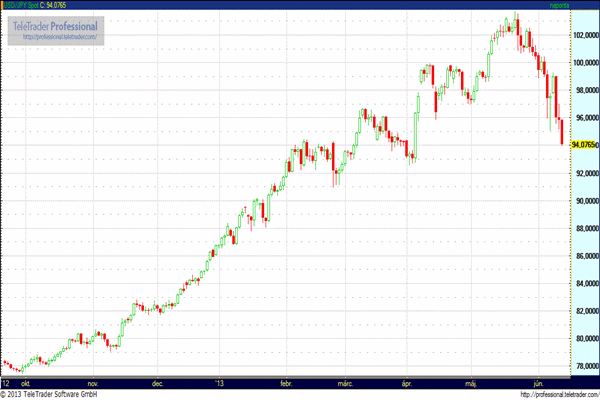 A Nikkei index április eleje óta nem járt 13.000 pont alatt. Az eladói nyomás a jen erősödését követően fokozódott, az USD/JPY jegyzése a Fed eszközvásárlási programjának jövőjével kapcsolatos félelmek miatt a tegnapi 96 jenes szintről 94 jenre esett, az árfolyam 95-ös szint alatt április eleje óta nem tartózkodott.