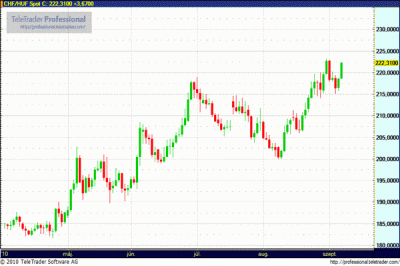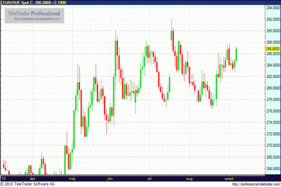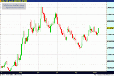 A svájci frank jegyzése 222,31 forint volt 217,99 forint után, száz japán jent 267,99 forinton jegyeztek 262,65 forint után. Az euró árfolyama a dollárral szemben 1,2870 körüli jegyzésről 1,2800 alá, a jennel szemben 108,40-ről 107,40-re, a svájci frankkal szemben 1,3050-ről 1,2908-ra zuhant. Nagy az esély arra, hogy az euró megdönti a svájci frankkal szemben augusztus 31-én 1,2848-as jegyzésen elért árfolyam mélypont rekordját, mindennek nyomán pedig a forint is újabb mélypontra kerülhet az alpesi devizával szemben, ehhez mindössze a múlt héten elért 223,31-es szinten kell átlépnie.