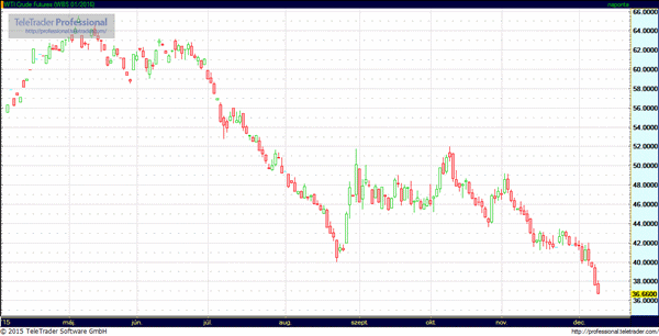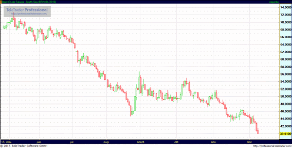 Az amerika könnyűolaj (WTI) januári szállítású jegyzése 2,4 százalékos csökkenés mellett 36,70 dollárnál jár hordónként. Ilyen alacsony szinten 2009 februárja óta nem volt az árfolyam. Tegnap a kontraktus 5,8 százalékkal csökkent. Az olaj mélyrepülése az OPEC múlt heti közgyűlése után erősödött fel, miután a szervezet nem tudott megállapodásra jutni a kitermelési kvóta csökkentéséről. Ahelyett hogy csökkentette vagy a várakozásoknak megfelelően szinten tartotta volna a kvótát, 1,5 millió hordóval megemelte a jelenlegi napi 31,5 millió hordó kitermelés értékre.