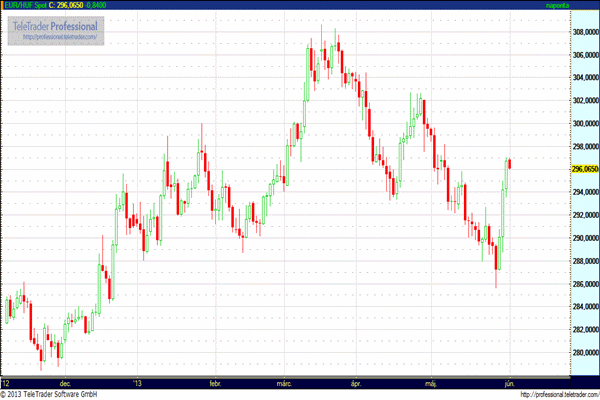 EUR/USD (1,2920 – 1,3080): Az egész napos dollár erősödést a vártnál jobb chicago-i PMI, és michigani bizalmi indexek megjelenése is erősítette a reggeli 1,3050-esről az 1,2950-es szintig. A jó adatok alapján a QE3 program összegének már nyári csökkentése is felmerülhet a piaci szereplőkben. Éppen ezért figyeli mindenki a héten megjelenő amerikai, a piaci hangulat, és várakozások szempontjából kiemelten fontos adatokat.