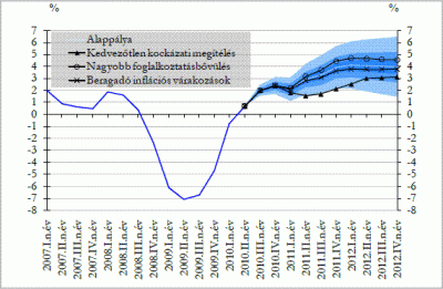 Jövőre is gyorsabb bővülést vár a jegybank az augusztusi inflációs jelentésében jelzettnél: 2,8 százalék helyett 3,1 százalékkal bővülhet a gazdaság. A 2011-es inflációs előrejelzését jelentősen, 0,5 százalékponttal 4 százalékra emelte, 2012-re azonban 3,3 százalékra mérsékelte 3,4 százalékról. A bizottság várakozásai szerint jövőre megkezdődik a munkanélküliség lassú csökkenése (idén 11,1, jövőre kerek 11, 2012-ben 10,3 százalék), és kisebb lesz az infláció is: az idén 4,7, jövőre 3,9, 2012-ben 3,7 százalékot várnak.