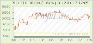 A Richter papírok árfolyama 590 forinttal, 1,64 százalékkal 36.490 forintra nőtt, a részvények forgalma 808,6 millió forintot ért el. A másik gyógyszeripari részvény, az Egis 289,6 millió forintos forgalom mellett 5 forinttal, 0,03 százalékkal 16.195 forintra gyengült. A BUMIX 1.243,44 ponton zárt kedden, ez 1,11 pontos, 0,09 százalékos emelkedés a hétfői záráshoz viszonyítva. (MTI)