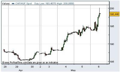 A svájci frank jegyzése 200 forint felett is járt egy kis időre csütörtökön.A svájci fizetőeszköz árfolyama 15 óra után érte el a 200,06 forintos jegyzést, de szinte azonnal korrigált, jelenleg 198,44 forintnál jár.