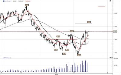 Technikailag fontos, hogy a négyórás grafikonon az árfolyamok már szépen fölé mentek a 200 napos mozgóátlagnak, valamint az 5,3$-os ellenállás leküzdésén dolgoznak. Egy magasabb forgalmú momentum el is döntené a hétre a további trendet. A következő ellenállások 5,6$-nál, 6$-nál, 6,3$-nál találhatóak. Támaszok 5$-nál, valamint az 55 napos mozgóátlagnál (vastagabbik fekete mozgóátlag).