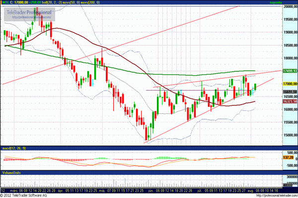 A 16.500 forintos szint megfogta a letörést, próbál visszatérni az ék alakzatba az árfolyam, azonban a gyenge forgalom alapján nem számítunk jelentősebb emelkedésre. Ha sikerül is túljutnia 17.000 forinton hamar ellenállásba ütközhet 17.200-300 forintnál. Támasz 16.500 és 16.750 forintnál.