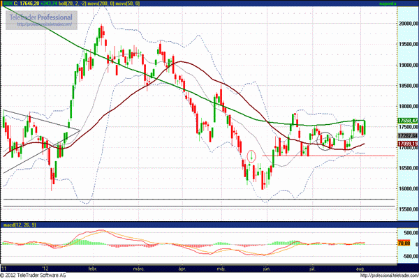 Nem esett tovább pénteken az 50 napos mozgóátlag irányába, a 20 naposról a piaci hangulat fordulásának köszönhetően emelkedni tudott, ezzel visszatért a 200 napos mozgóátlaghoz. Ameddig az 50 és a 200 napos mozgóátlagok közül nem tud kilépni, addig maradhat az iránytalan sávozás. Támasz a 20 és az 50 napos mozgóátlagoknál.