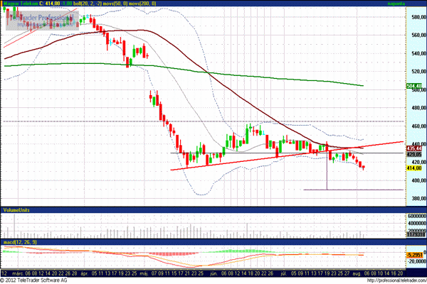 A Telekom árfolyama nem okozott meglepetést a pénteki kereskedés során, folytatta a 430-as szintről megindult csökkenését, visszatért a májusi mélypontjára.