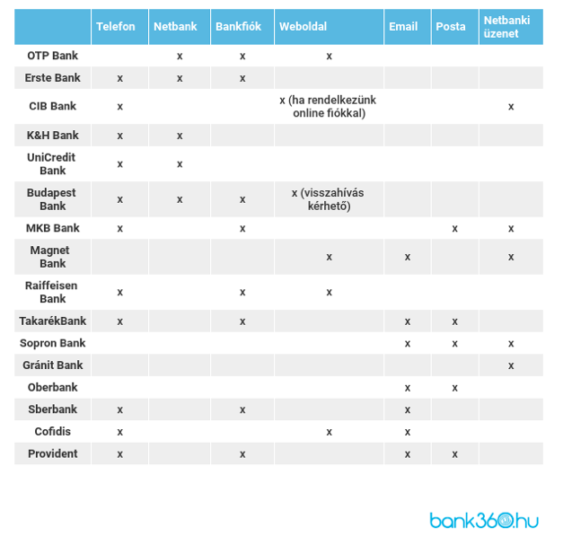 A netbankon keresztül leadott nyilatkozatok esetében az ügyfelek eleve azonosítva vannak és a telefonos ügyintézés során is azonosítják az ügyfeleket adataik alapján. Bankfiókban személyes okmányokra, illetve a hitelszerződés adataira van szükség. A Takarékbank tájékoztatta a portált: magánszemély esetén az adós neve, születési helye és ideje, valamint a kölcsön típusa, lejárta és ügyletazonosítója szükséges a nyilatkozathoz, amelynek sablonját le lehet tölteni a bank honlapjáról. A K&H Bank az azonosítással kapcsolatban azt kérte, hogy az ügyfelek lehetőség szerint a hitelük azonosító számát tüntessék fel, amennyiben üzenetet írnak.