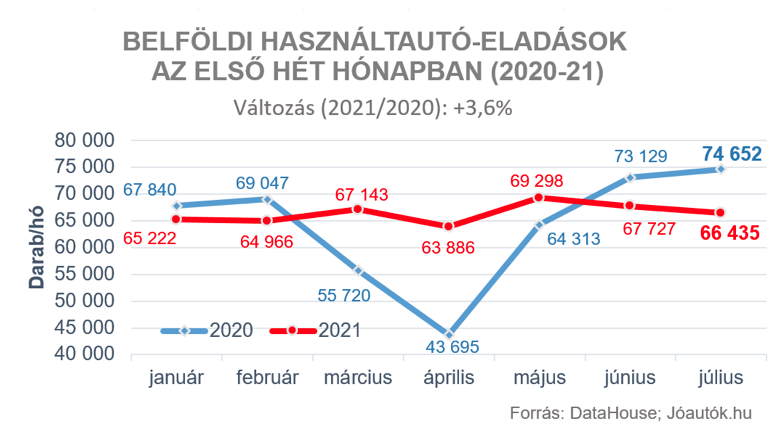 A magyarországi használtautó-piacon leggyakrabban továbbra is Opel személyautók cserélnek gazdát, e márkát követi a Volkswagen és a Suzuki: a három márka részesedése együttesen 31 százalékot tesz ki. Jelentős többségükben idősebb autók adásvétele zajlik a piacon: az idén eddig átírt autók 76 százaléka legalább 10 éves volt. Miközben a használtautó-piacon a 2021 első hét hónapjában gazdát cserélő közel 465 ezer személyautó mennyisége 3,6 százalékkal haladja meg az előző év hasonló időszakában regisztrált 448 ezres értéket, az importált használt autók száma ugyanebben a periódusban 74 400 darab volt, ami 3,7 százalékkal maradt el az egy évvel korábban mért 77 300-as értéktől.