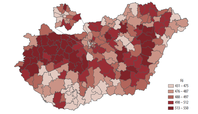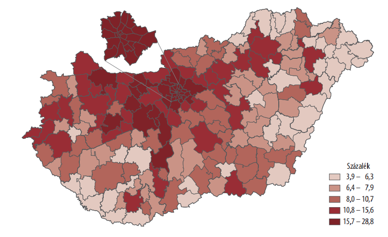 Ennél magasabb arány döntően a fővárosban és az ahhoz közeli járásokban, valamint Középés Nyugat-Dunántúl egyes járásaiban – összességében a járások 29%-ában – volt jellemző. A járások ötödében – főként Észak-Magyarországon, Észak-Alföldön és Dél-Dunántúlon – a legmagasabb jövedelműek aránya 6,4% alatt volt.