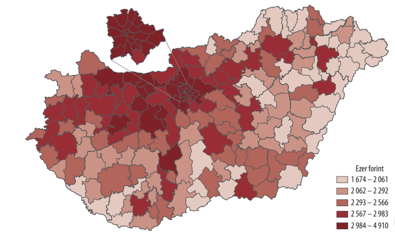 A járások háromnegyedében a mutató nem érte el az országos átlagot, a legalacsonyabb értékek – összefüggésben a munkaerőpiaci helyzettel – az ország északkeleti és déli, (nagyrészt) határ menti járásait jellemezték. 2018-ban az egy adózóra jutó személyijövedelemadó-alapot képező jövedelem összege 2,8 millió forint volt.
