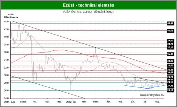 Az ezüst árfolyamában is megfigyelhető egy biztató bázisépítés a szürke görbével jelölt 50-napos mozgóátlag magasságában. A kritikus küszöb és egyben áttörendő ellenállás 28 dollár környékén húzódik. Ezt pedzegeti immár hetek óta kurzus, de egyelőre nem bír még vele. Mindazonáltal a grafikonon rövidtávon kirajzolódó háromszögalakzat a feloldás határán van, amelyből az aktuálisan érvényesülő emelkedő momentum okán inkább a felfelé irány lehet most valószínűbb.