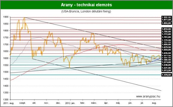 Az arany árfolyama nem képes elmozdulni a holtpontról. Bár továbbra is a lélektanilag fontos 1.600 dolláros árszint felett tartózkodnak a jegyzések, de ettől az értéktől számottevően eltávolodni felfelé egyelőre nem sikerül az árfolyamnak. A dollár kilengései csak kisebb impulzusokat adva csiklandozzák a sárga nemesfémet egyszer kissé feljebb, máskor meg éppen lejjebb, de egyértelmű iránya nincs a kereskedésnek.