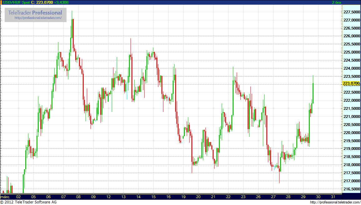 A forint a cseh koronával "kézen fogva" elvált a lengyel zlotytól és a román lejtől, jelentősen alulteljesíti a lengyel devizát. Ebben szerepet játszhatott, hogy a csütörtöki aukció nem sikerült túl fényesen, s ez tovább rontotta a magyar hangulatot. Az euró árfolyama 296,1 forintnál járt délután fél hat után, a reggelihez képest közel négy forinttal gyengült, 292,50 volt a legalja eddig. Kereskedők úgy vélekedtek, ahhoz, hogy a 295-öt átlépje az árfolyam, még más negatív lökésre is szükség volna.
