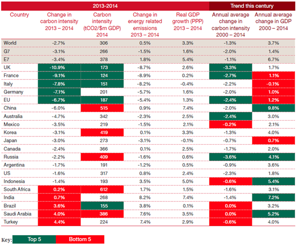 A szén-dioxid-intenzitás az üvegházhatást okozó gázok energiával kapcsolatos kibocsátását méri a GDP egymillió dollárjára vetítve. Eszerint a széndioxid-intenzitás 2014-ben 2,7%-os csökkenést mutatott, amely a PwC elemzésének első megjelenése óta eltelt hét év legmeredekebb csökkenése. A 2014-ben elért 3,2%-os globális gazdasági növekedést az energiával kapcsolatos kibocsátás mindössze 0,5%-os növelésével sikerült elérni.