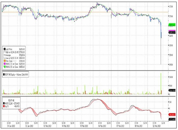 A ma délutáni órákban óriási kilengést mutatott a Richter árfolyama, amelyet egy, az átlagos forgalom többszörösét adó eladói megbízás okozott, ami 34.500 forintig nyomta le a Richter árfolyamát.- Az esés rendkívül gyorsan, másodpercek alatt zajlott le, ahogy az a fenti 15 perces grafikonról is jól kivehető.- Az alacsony forgalom következményeként gyorsan esett az árfolyam és a zuhanást elindító óriási, feltételezhetően előre rögzített automatikus megbízás csak 34.500 Ft-os árfolyamon tudott teljesülni, ugyanis a közbenső szinten nem állt jelentős mennyiségű vevő az ajánlati könyvben.