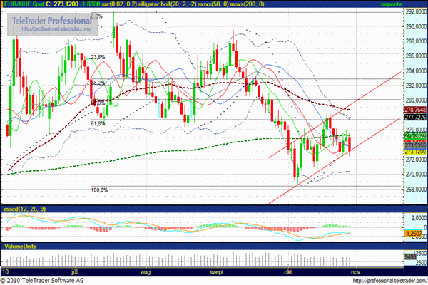 Az október 6-án megindult korrekció kereteit feszegeti az árfolyam, a 277,50 szintnél lévő ellenállás megállásra késztette a korrekciós emelkedést még a múlt hét folyamán. Az ellenállásról élesen lefordult, viszont a korrekciós emelkedő sáv alja ezidáig megfogta.