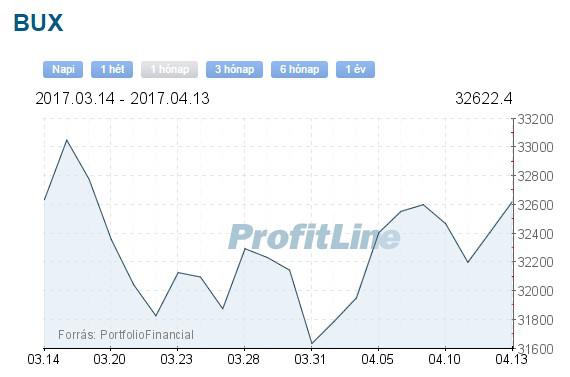 A Budapesti Értéktőzsde részvényindexe, a BUX 212,46 pontos, 0,66 százalékos emelkedéssel, 32 622,40 ponton zárt csütörtökön. A részvénypiac forgalma 6,8 milliárd forint volt. A Mol 195 forinttal, 0,93 százalékkal 21 100 forintra erősödött, 2,4 milliárd forintos forgalomban. Az OTP-részvények ára 25 forinttal, 0,31 százalékkal 8079 forintra csökkent, forgalmuk 1,9 milliárd forintot tett ki. A Magyar Telekom árfolyama 4 forinttal, 0,82 százalékkal 493 forintra nőtt, forgalma 638,4 millió forint volt. A Richter-papírok árfolyama 105 forinttal, 1,56 százalékkal 6855 forintra emelkedett, a részvények forgalma 1,7 milliárd forintot ért el.