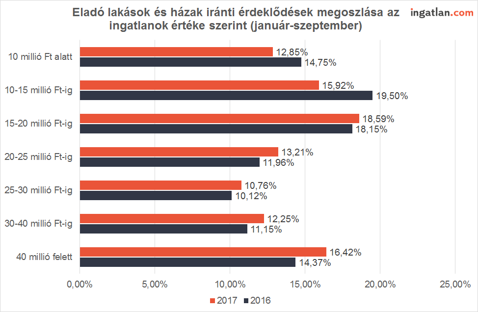 A lakáspiac egyik legnépszerűbb szegmensét jelenti a 25 millió forint alatti kategória: az idén a lakások és házak iránt érdeklődők 61 százaléka keresett 25 millió forintig lakóingatlant, ami némi csökkenést jelent a tavalyi 64 százalékhoz képest - derül ki az ingatlan.com legfrissebb elemzéséből. Balogh László, az ingatlan.com vezető gazdasági szakértője elmondta, az érdeklődők arányának csökkenése elsősorban azzal magyarázható, hogy a lakáspiaci drágulás miatt egyre kevesebb lakást kínálnak a 25 millió forintos lélektani határ alatt, így ezekre kevesebb érdeklődés is érkezik. Az olcsóbb ingatlanok kínálatcsökkenése leginkább a 15 millió forintnál nem drágább lakások esetében különösen látványos. Tavalyhoz képest 2017-ben ugyanis 12,5 százalékkal kevesebb ingatlan volt elérhető a piacon ebben az árkategóriában. Ezt némileg ellensúlyozza, hogy háztartások jövedelme emelkedett, így sokan nagyobb megtakarítással vághatnak bele a lakásvásárlásba, illetve könnyebben juthatnak hitelhez is.