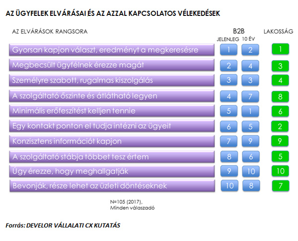 Általánosságban elmondható, hogy a vállalatok kifejezetten jól érzik az ügyféligények változásait. A megkérdezett vállalati döntéshozók véleménye alapján a fogyasztók elsősorban gyorsaságot, a megbecsültség érzését, illetve személyre szabott ajánlatokat várnak el, ami többé-kevésbé egybe is vág a lakossági kutatás eredményeivel. Egyetlen ponton azonban szembetűnő az eltérés, a fogyasztók az előbbiek mellett ugyanis kiemelten fontos tényezőnek tartják a hatékonyságot is, azaz hogy ügyeiket egyetlen ügyfélszolgálati csatornán keresztül el tudják intézni, ez az igény a vállalati rangsor második harmadában kapott csak helyet.