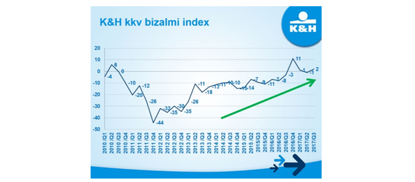 A hazai mikro-, kis- és középvállalkozások egy éves várakozásait jelző K&H kkv bizalmi index értéke 3 pontot emelkedett, így jelenleg 2 ponton áll. „Az utóbbi három évben kisebb-nagyobb visszaesésekkel ugyan, de fokozatosan javulnak a cégek várakozásai. A mostani, enyhe emelkedés annak köszönhető, hogy erősödött a cégek munkaerő-felvételi szándéka, és a közterhekben is pozitív változásra számítanak, míg a pénzügyekben felemás eredményt, növekvő árbevételt, de alacsonyabb profitot várnak a következő egy év során” – mondta el Kovács Viktor Zoltán, a K&H kkv marketing főosztály vezetője.