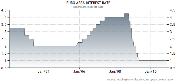 Az EKB irányadó kamata 2000-től 2008 októberéig 4,25 százalék volt, azóta pedig a világméretű gazdasági válság elmélyülésével párhuzamosan folyamatosan csökkent, egészen 2009 tavaszáig. Az euróövezet központi bankja legutóbb akkor, 2009 májusban változtatta az alapkamatot, akkor 25 bázisponttal 1,00 százalékra csökkentette.