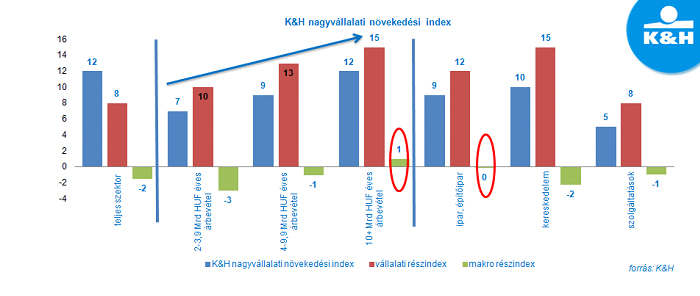 A hazai, 2 milliárd feletti éves árbevételű nagyvállalatok aktuális gazdasági helyzetéről és növekedési kilátásairól képet adó K&H nagyvállalati növekedési index gyakorlatilag alig változott év eleje óta, jelenleg 8 ponton áll. Az eredmény a nagyvállalati döntéshozók stabil, óvatos optimizmusát tükrözi, maguk mögött hagyva a tavaly év végi mélypontot. „A több mint 500 nagyvállalati vezető körében végzett felmérésünk alapján a cégek várakozásai stabilnak tekinthetők a következő egy évre.