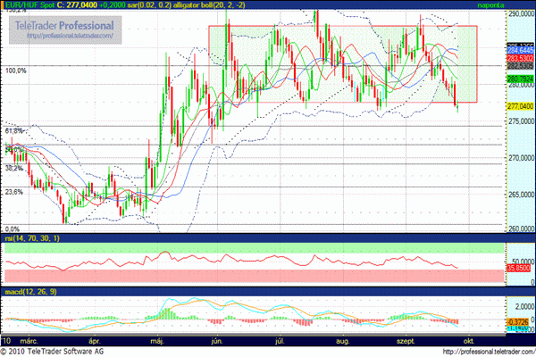 A 288 forintnál lévő sávtetőről szinte megállás nélkül zuhant egészen a 277,50-es szint alá. Az elmúlt hónapok során már volt három sikertelen kísérlete, melyeket követően meg sem állt az emelkedés egészen a sávtetőig.