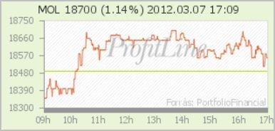 A Mol 210 forinttal, 1,14 százalékkal 18.700 forintra erősödött, 1,9 milliárd forintos forgalomban. Az OTP részvények ára 98 forinttal, 2,59 százalékkal 3.689 forintra csökkent, forgalmuk 13,6 milliárd forintot tett ki. A Magyar Telekom árfolyama 5 forinttal, 0,88 százalékkal 565 forintra esett, forgalma 704,1 millió forint volt. A Richter papírok árfolyama 135 forinttal, 0,36 százalékkal 37.350 forintra gyengült, a részvények forgalma 606,9 millió forintot ért el. A másik gyógyszeripari részvény, az Egis 200,9 millió forintos forgalom mellett 115 forinttal, 0,75 százalékkal 15.465 forintra nőtt. A BUMIX 1.251,06 ponton zárt szerdán, ez 0,13 pontos, 0,01 százalékos emelkedés a keddi záráshoz viszonyítva. (MTI)