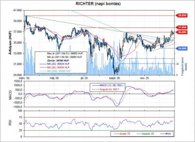Múlt héten rés kíséretében tört ki felfelé a gyógyszerpapír. Az év elején egy szűk sávban oldalazott az árfolyam (35.200-25.900 között), amelyből akkora lendülettel tört ki, hogy két kereskedési napon belül elérte a 36.900 forintos ellenállást. Jelenleg még birkózik a szinttel, de a technikai kép alapján további emelkedésre számítunk.