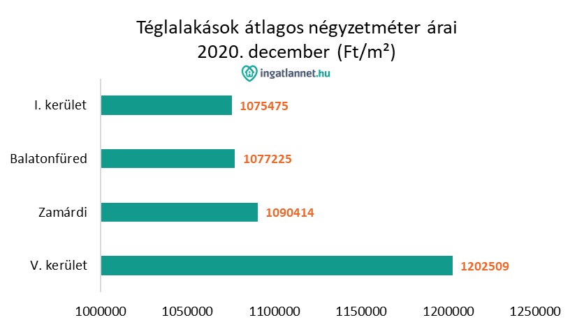 Hazánk legdrágább ingatlanpiacain, többek között a főváros V. kerületében, egy téglalakásért átlagosan 1,2 millió Ft/m²-t kértek el. Az I. kerületben és Balatonfüreden 1,07 millió Ft/m²-ért kínáltak eladásra lakásokat. Bár elég magasak ezek az árak, az európai árszínvonalat még sem érik el, ahol átlagosan 1,5-2 millió forintot kérnek a lakások egyetlen négyzetméteréért.