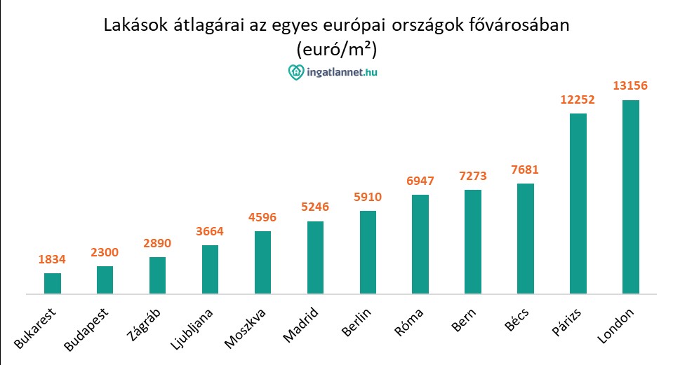 A vizsgált európai városok közül a legmagasabb áron a Londoni lakásokat kínálták eladásra. Itt egy négyzetméter átlagára meghaladta a 13 ezer eurót. A második legdrágább város Párizs, ahol több mint 12 ezer eurót kérnek el a lakások egyetlen négyzetméteréért. Majdnem fele annyiért kínáltak lakásokat Bécsben, Bernben és Rómában. Ezekben a városokban mintegy 6-8 ezer euró/m² között kínáltak eladásra lakásokat a tulajdonosok. Európai viszonylatokban úgymond középkategóriás Moszkva és Madrid, ahol az átlag kínálati ár 4-6 ezer euró/m². Ennél kedvezőbb, de még magas 2800-3700 euró/m² átlagár jellemző Zágráb és Ljubljana lakáspiacára. A vizsgált városok közül a legalacsonyabb lakásárat Budapest és Bukarest mutatja. A hazai és a szomszédos fővárosban a lakásokat 1800-2300 euró/m² átlagáron kínálták eladásra.