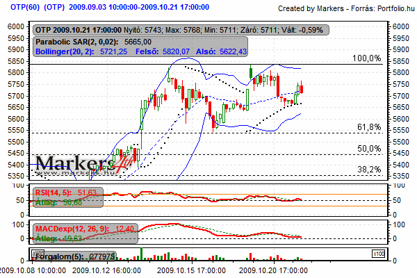 Egy helyben topog az árfolyam, annak ellenére, hogy az elmúlt négy kereskedési napból háromban az eladók voltak túlsúlyban. Eléggé ellaposodott az OTP piaca, amíg az iránykeresés tart nem érdemes belekapni a részvénybe. Felülről ellenállás 5750 és 5800 forintnál, csökkenésben viszont támasz 5650 és 5550 forintnál található.