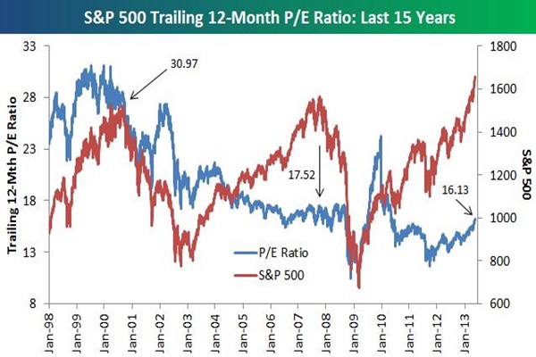 1. Az amerikai S&P 500-as részvényindex visszamutató P/E rátája 16 fölé került. Bár igaz, hogy még mindig alatta vagyunk az elmúlt 15 év átlagát jelentő 18-as P/E szintnek, de amikor legutóbb, 2010 áprilisában a piac elérte a 16-os P/E mutatót, jelentős korrekció kezdődött.
