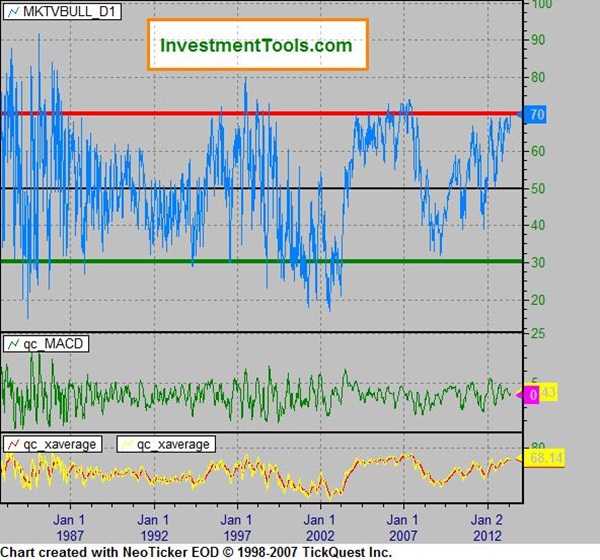 2. Ugyancsak masszív esést lehet kiolvasni abból, hogy a befektetői szentimentet tükröző Market Vane Bullish Consensus mutató 70 százalékra ugrott. A legutóbbi, 2007. június 22-ei ilyen magas értékét követően óriásit zuhant.