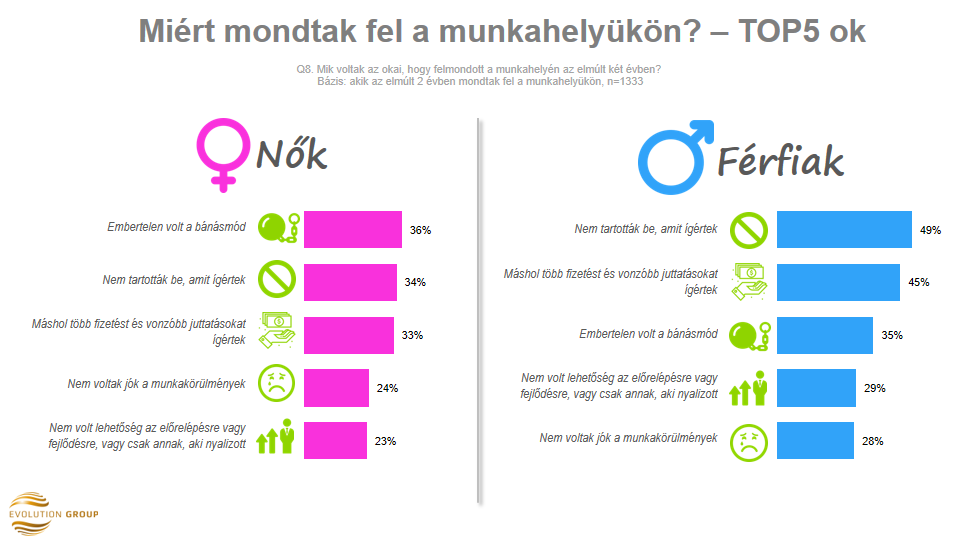 A férfiak számára különösen fontos ez a szempont, 49%-uk mondott fel ezért, míg a nők 34%-a. A felmondás második leggyakoribb (39%) indoka, hogy máshol több fizetést és vonzóbb juttatásokat ígértek. A harmadik ok az embertelen bánásmód és környezet, ami miatt a megkérdezettek 35%-a váltott munkahelyet.