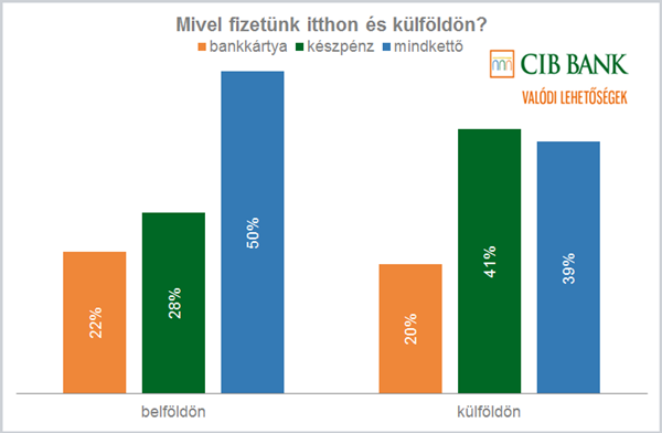 A CIB Bank kutatása szerint kirándulásra a válaszadók 86 százalék visz magával bankkártyát, míg a strandra 45 százalék. Legjellemzőbb a bankkártyával történő fizetés a mozikban és színházban. Vendéglátóhelyen a megkérdezettek több mint fele szokott esetenként bankkártyával fizetni, míg negyedük jellemzően azzal fizet. Belföldön átlagosan háromezer forint alatt hajlamosabbak a válaszadók készpénzzel fizetni. A megkérdezettek fele készpénzt és bankkártyát is egyenlő arányban használ, 28 százalék áll inkább a készpénz és 22 százalék inkább a bankkártya oldalán. A készpénzben hívők szerint ez a kényelmesebb, miközben a bankkártyát használók ugyanezt állítják a saját fizetőeszközükről.