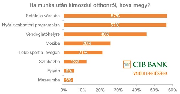 Nem meglepő, hogy nyáron a válaszadók előszeretettel választanak szabadtéri programokat, tesznek sétát a városban vagy keresnek fel vendéglátóhelyeket munka után: közel felük jelölte meg ezt esti programnak, míg több mint negyedük szívesen jár moziba, ötödük pedig többet sportol a szabad levegőn.