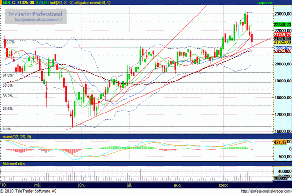 A tegnapi napon is folytatódott a 23.000 pontról megindult esés, ennek nyomán 21.500 forint alatt zárt. Némi öröm az ürömben, hogy a csökkenés mutatkozik a forgalomban, így elképzelhető, hogy a mai napon visszahúzzák 21.500 forint fölé, miután tegnap megérintette az emelkedő trendvonalat is.