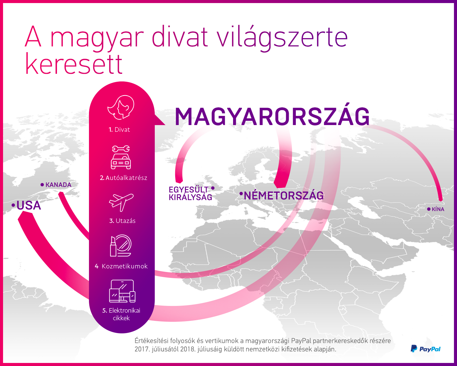 A nemzetközi vásárlások legnépszerűbb termékkategóriái továbbra is a ruházat, lábbelik és kiegészítők (68%), ezt követik a fogyasztói elektronikai cikkek, a számítógépek, tabletek, mobileszközök és perifériák (53%), valamint a játékok és a hobbi termékek (53%). A magyar fogyasztók ettől némileg eltérően elsősorban ékszereket és órákat (68%), játékokat, hobbi termékeket (63%), ruházatot, lábbelit és kiegészítőket (60%) vásárolnak külföldi webshopokban. A PayPal adatai alapján a magyar kereskedők számára legfontosabb piacok az USA, Németország, Egyesült Királyság, Kanada és Kína, ahonnan leginkább divatcikkeket, autóalkatrészeket, utazási szolgáltatásokat, kozmetikai és háztartási cikkeket, elektronikai eszközöket és szoftvereket vásárolnak. „A magyarországi PayPal partnerkereskedők számára az elmúlt egy évben a legdinamikusabban növekvő piacok Svájc, Lengyelország, Kína, Németország és Törökország voltak” –fűzi hozzá Marcin Glogowski.